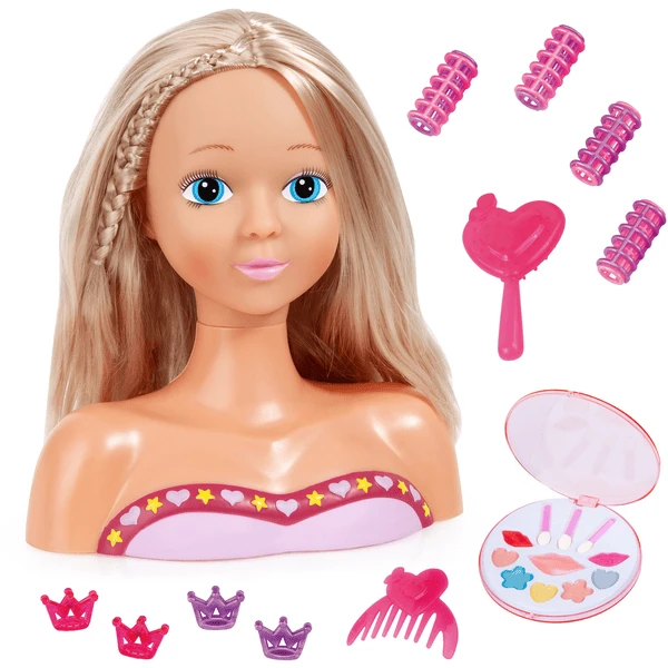 - 1 Topmodel 27 cm met cosmetica, inclusief borstel, kam, clips en krulspelden.