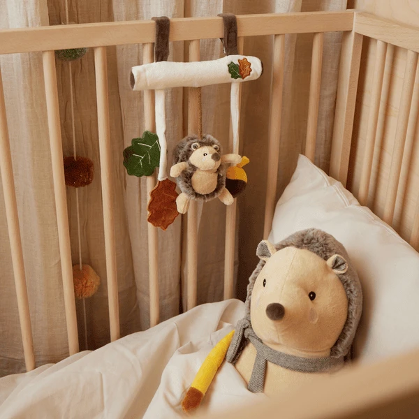 De bladeren knisperen als je ze vastpakt, de egel ratelt zacht en de noot piept vrolijk als je erin knijpt.