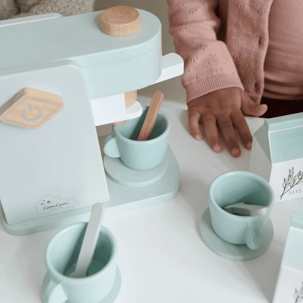 - Schattig houten speelkoffiezetapparaat in zachte kleuren met retro- Touch