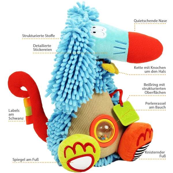 Crazy Bob is een geweldige metgezel voor de kleintjes. Met zijn lange neus is hij altijd op zoek naar nieuwe gekke avonturen en natuurlijk een bot om te plukken. Samen met hem is er veel te ontdekken. Hij piept van vreugde als je op zijn neus drukt en de kleurrijke ballen in de rammelaar zorgen voor vermaak en dansen in wanorde als je zijn buikje kietelt. Er is veel opwinding bij het ontdekken van zijn kleine geheimen, zoals het gekraak of de kleine spiegel op zijn poten. Met zijn pluizige vacht ziet hij er niet alleen een beetje gek uit, je kunt ook met hem knuffelen en knuffelen omdat hij zo zacht is.