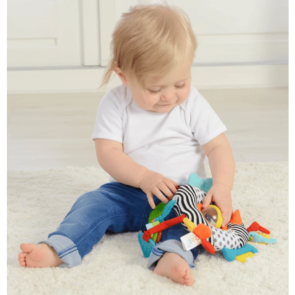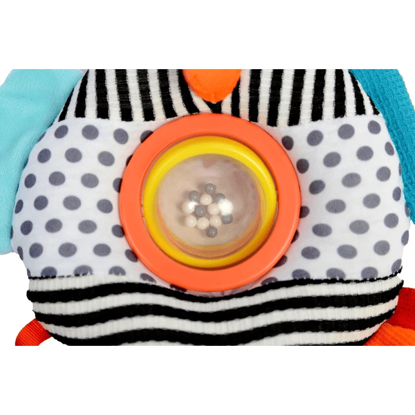 Hij heeft knopen, bijtringen en een rammelaar in zijn buik. Deze vogelknuffel is niet alleen leuk om mee te knuffelen, hij bevat ook verschillende activiteiten. Je zult genieten van het maken van de piepende en rammelende geluiden.