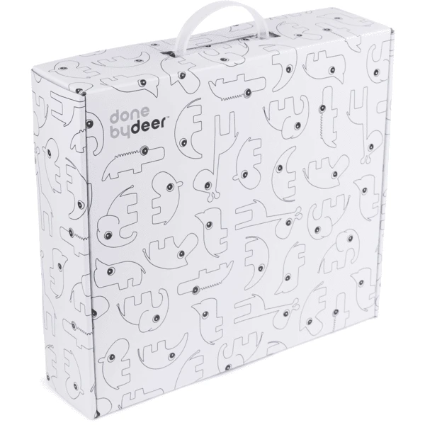 De schattige speeltjes zijn groen, mosterdgeel en grijs. De stevige witte kartonnen doos is versierd met onze klassieke zwarte contourenprint en is een prachtige opbergdoos in de kinderkamer.