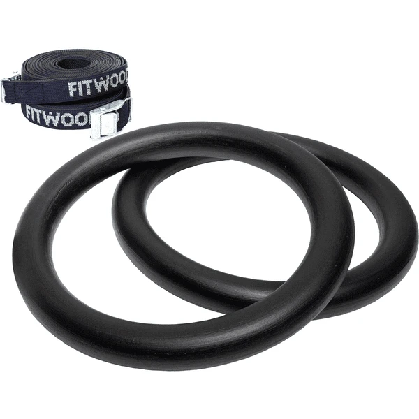 - De gymnastiekringen worden geleverd met duurzame FitWood banden waarmee de gymnastiekringen aan het plafond of bijvoorbeeld aan de AARNI wandstangen kunnen worden bevestigd.