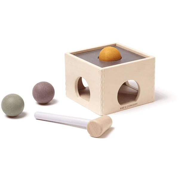 Het nieuwe hammerspel uit de NEO-serie van Kids Concept . Kleurrijke houten ballen worden door de openingen in de doos ‘geslagen’ en rollen er aan de zijkant weer uit. Om de motoriek en de oog-hand coördinatie te bevorderen.