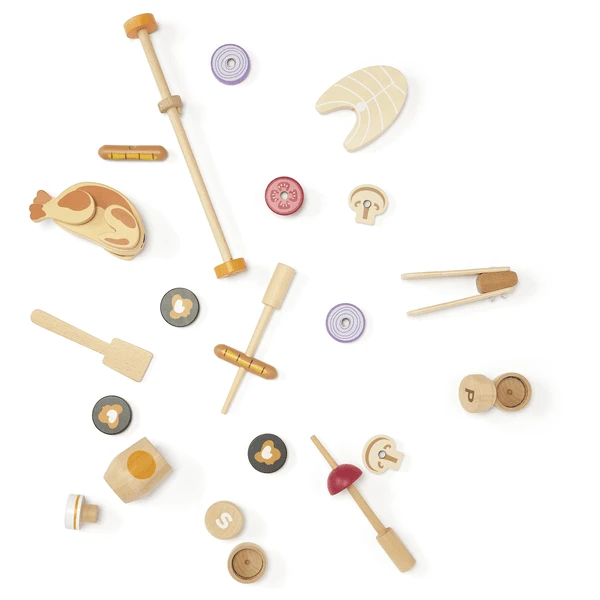 - Bevat 22 delen: Barbecue en spit, 2 spiesen, 2 worsten, 1 kip, 1 zalm, 2 schijfjes tomaat, 2 champignons, 2 schijfjes rode ui, 3 stukken houtskool, peper en zout, potje mosterd, barbecuetang en -draaier