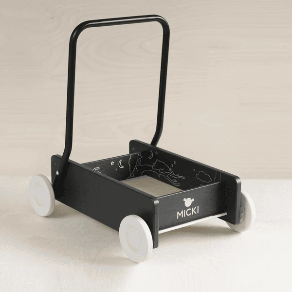 - De premium houten kinderwagen heeft gegraveerde details aan de binnenkant van de kinderwagen, biedt het kind een stabiele en veilige houvast bij zijn eerste stapjes en heeft wielen met remmen en een verstelbare handgreep.