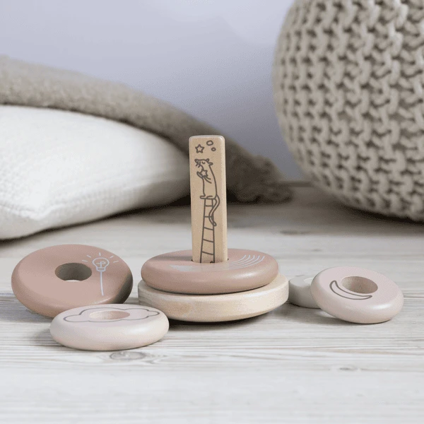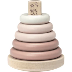 - De ringen kunnen in willekeurige volgorde gestapeld worden terwijl het kind op een speelse manier het gevoel krijgt hoe verschillende maten zich tot elkaar verhouden.