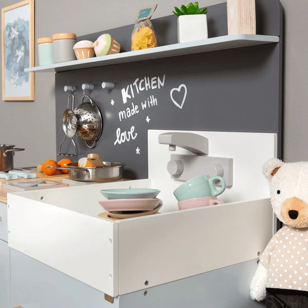 plezier voor de kleine chef-koks. De achterwand bestaat uit een grijs krijtbord