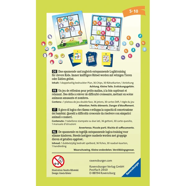 Hersenkrakers voor slimme kinderen: Hoort de sluwe vos of liever de brutale kaketoe in dit veld thuis? Slimheid is vereist bij het oplossen van een 4×4 of 6×6 Sudoku puzzel. 30 puzzelkaarten bepalen welke fiches er bij het begin op het speelbord komen te liggen. Dan moet je goed nadenken en combineren: Geen enkele kleur mag worden herhaald in een rij, kolom of gemarkeerd vierkant. Beginners beginnen op het 4×4-plan en worden geleidelijk enthousiast voor meer uitdagende taken. U kunt kiezen tussen grappige dieren en nummers voor de kleurenchips. Het wordt elke keer weer spannend als je na het oplossen van de Sudoku op de achterkant van de puzzelkaart kijkt of alles klopt.