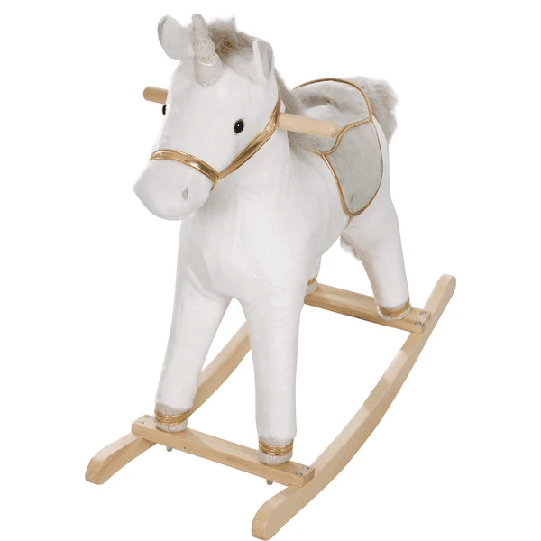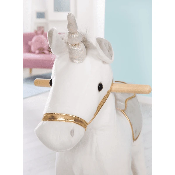 Het schommeldier is gemaakt van massief hout met liefdevolle stoffen bekleding in wit/grijs/goud. Het hobbelpaard Unicorn met zadel en hoofdstel is geschikt van 24 maanden tot 6 jaar. De afmetingen van het hobbelpaard zijn: LxBxH: 73x31x63cm, zithoogte 46cm, vulling van polyesterschuim. Alle gebruikte materialen zijn getest en gecertificeerd op schadelijke stoffen. Bovendien worden ze regelmatig gecontroleerd tijdens de productie.