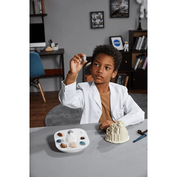 Oh, wat fonkelt het mooi! Kinderen gaan op schattenjacht met de “American Wave” edelsteenopgravingsset van Science Can en graven als echte geologen prachtige edelstenen op met hamer, beitel, kwast en co. Het speciale eraan: Al doende leren zij ook over spannende natuurspektakels en natuurverschijnselen van deze wereld.