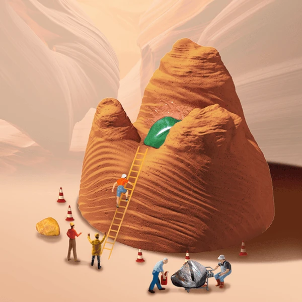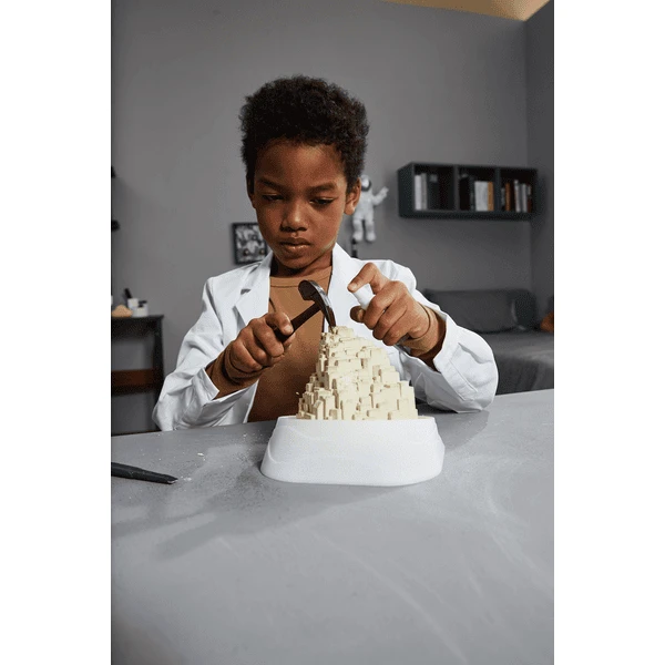 Stuk voor stuk graven de kinderen zich voorzichtig een weg door de rotsblok met realistische mijnbouwwerktuigen zoals hamer en beitel, terwijl ze hun ogen open houden voor glinsterende edelstenen. Als ze er een hebben ontdekt, banen ze zich voorzichtig een weg door de rotslagen om hem bloot te leggen.