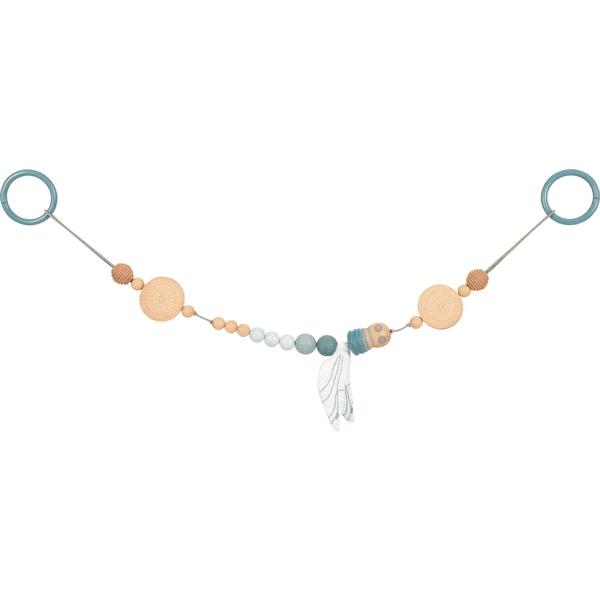 - In deze kinderwagenketting worden houten ballen van verschillende grootte met een houten libel, waarvan de vleugels gevuld zijn met knisperende folie, aan een met stof bekleed elastiek geregen.