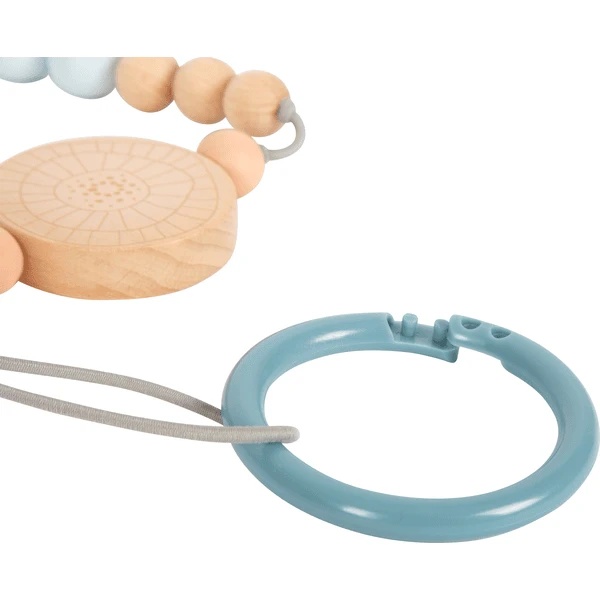 - Natuurlijke houten elementen en de zachte kleuren van modern maken van deze kinderwagenketting een functionele blikvanger – hij staat niet alleen mooi aan de kinderwagen, maar ook aan de babyautostoel, het kinderbedje, in de auto of aan een haakje boven de commode.