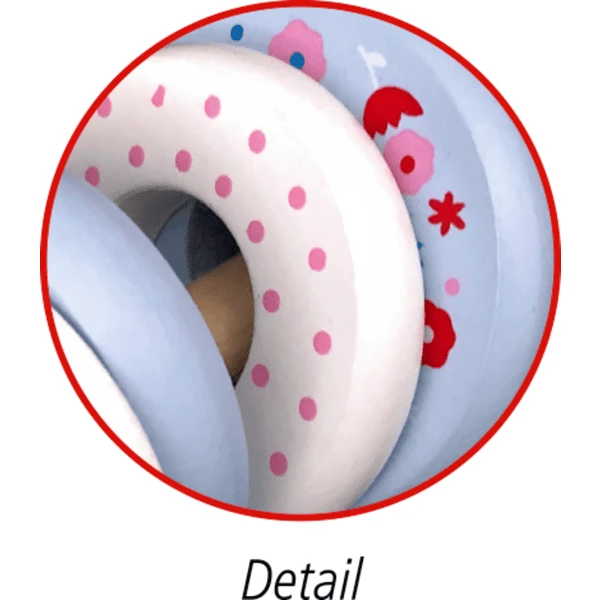 - Deze bedrukte houten rammelaar nodigt zelfs de allerkleinsten uit om te grijpen en te ontdekken